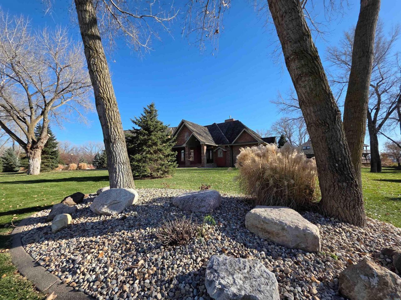 A refined expression of craftsmanship and comfort, this 1.5-story residence is set on a private 1.28-acre cul-de-sac lot in Dakota Dunes, surrounded by mature trees and quiet luxury. A grand entry with leaded-glass windows opens to soaring 19-foot cathedral ceilings with exposed beams, rich cherry woodwork, and a statement stone fireplace anchoring the great room. Designed for both elevated entertaining and everyday ease, the home flows seamlessly from formal dining into a custom kitchen featuring maple cabinetry, granite surfaces, stainless appliances, and an expansive island. Indoor-outdoor living takes center stage with a covered patio and brand-new TimberTech composite deck, creating a private backdrop for gatherings or quiet evenings. A dedicated den with double wood doors offers an ideal office or library space just off the entry. The primary suite is a true retreat, complete with a triple-tray ceiling, heated tile floors, dual vanities, whirlpool tub, and a walk-in tile shower. Two additional main-floor bedrooms are connected by a Jack & Jill bath, offering both comfort and privacy. Thoughtful updates and amenities include plantation shutters, a Generac generator, dual HVAC systems with tri-zone climate control, central vac, reverse osmosis water filtration, and recent appliance upgrades. An oversized garage with floor drain and hot/cold water adds everyday convenience. A rare opportunity to own a private, tree-lined property that balances timeless design, modern comfort, and effortless livability in one of the Dakota Dunes most desirable settings..